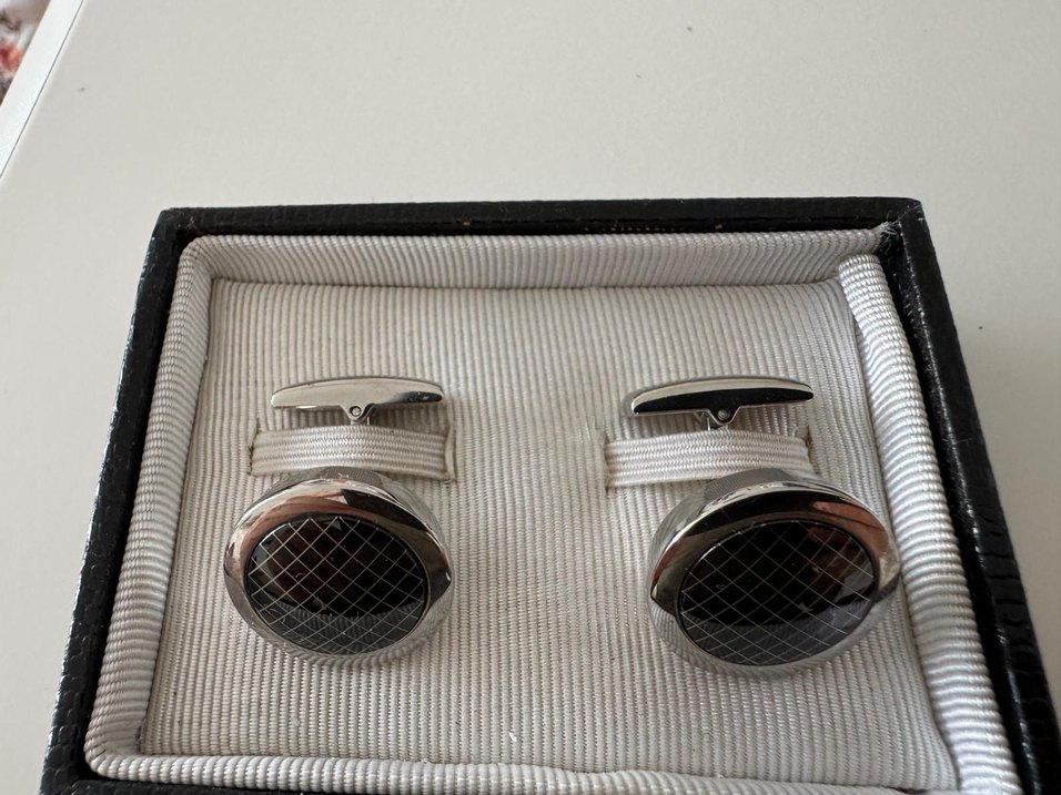 Gri desenli siyah yüzeyli parlak gümüş çerçeveye sahip erkek kol düğmesi. Bir kez kullanıldı bir sorunu yoktur.