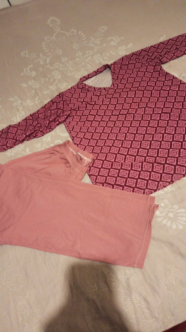 Pembe pastel tonlarda, V yaka ve uzun kollu, bol kesim ,üstü desenli, altı midi boy sade pantolonlu set. Özel dikimdir yeni sorunsuz,M ,L ve XL giyenler tercih edebilir