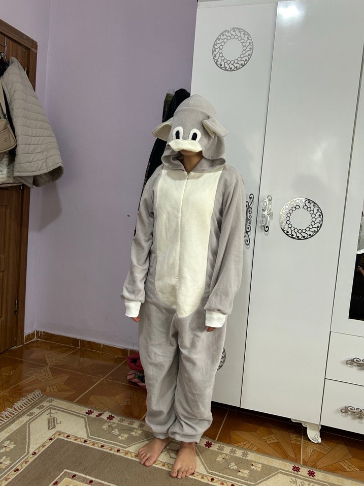 Gri renkte, pofuduk kumaştan yapılmış, kapüşonunda kedi kulakları ve yüz detayları bulunan sokak stili kedi kostümü.