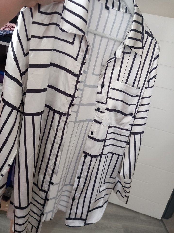 V yaka, düğmeli beyaz gömlek, çeşitli yönlerde siyah çizgilerle. Uzun kollu ve bol kesim, yumuşak sentetik kumaştan üretilmiştir.