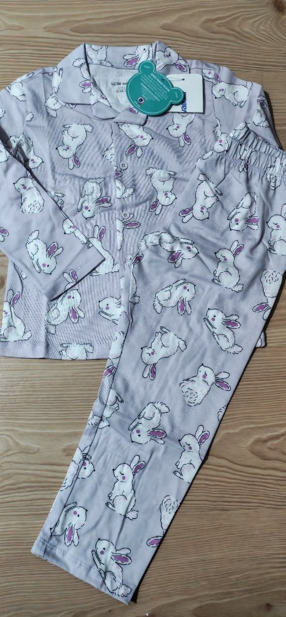 Lila renkli, uzun kollu ve yakalı pijama takımı, sevimli tavşan baskılarıyla desenlenmiştir. Rahat kesim ve uzun paçalıdır. 3-4 yaş