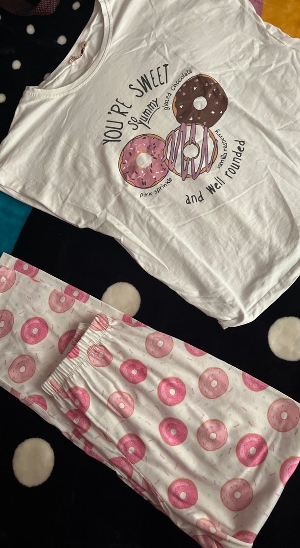 Yumuşak pamuktan üretilmiş, kısa kollu ve yuvarlak yaka, bol . Pastel pembe donut baskılı
