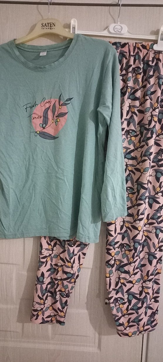 Pamuk kumaştan, uzun kollu, ,baskılı ve pastel yeşil renkte bol kesim pijama takımı Günlük rahat kullanım için uygun midi boyda.