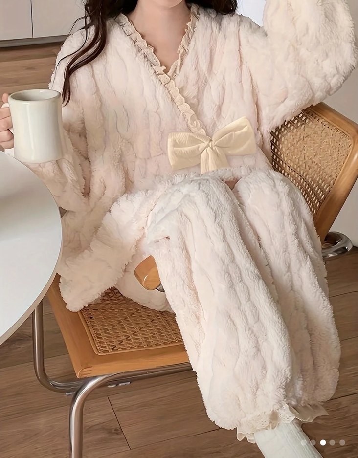 Yumuşak dokulu, uzun boylu beyaz rahat ev giyimi, gevşek kesim ve zarif detaylarla konfor sağlar.
