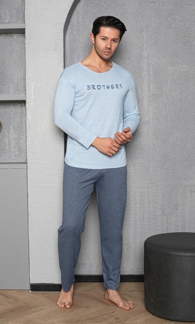 erkek pamuk uzun kol pijama takımı mevsimlik ürün açık mavi