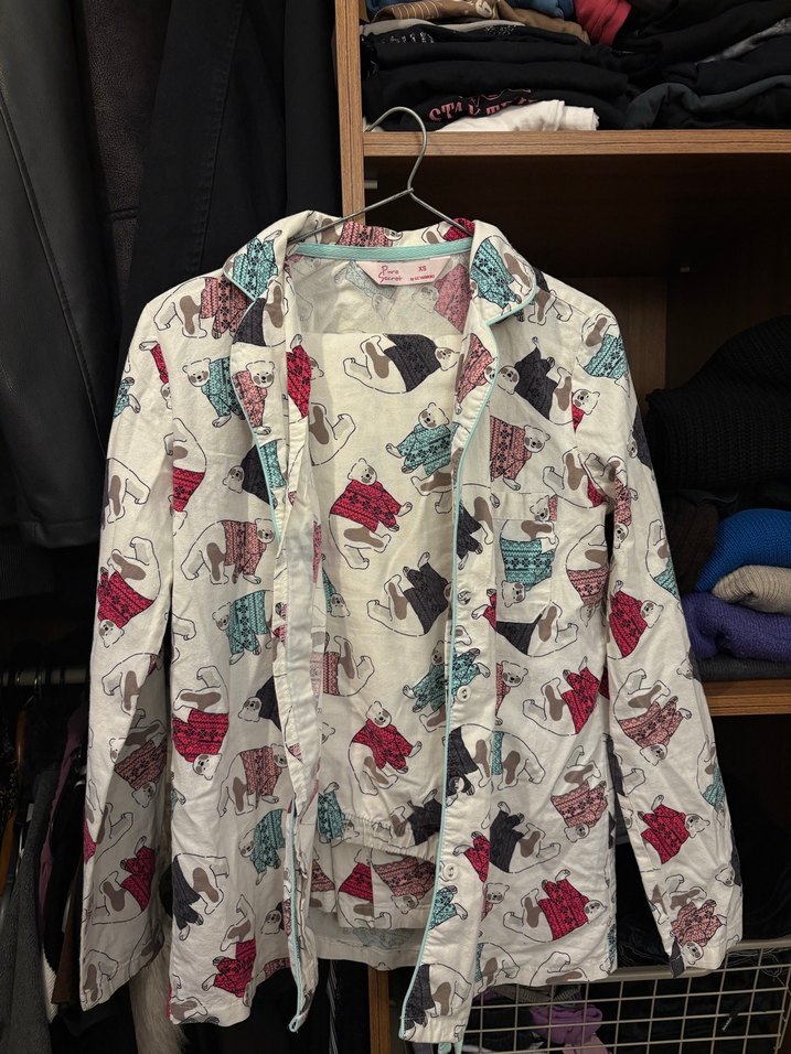 çok renkli ayı desenli, uzun kollu, düğmeli ve yaka detaylı alt üst pijama takımı