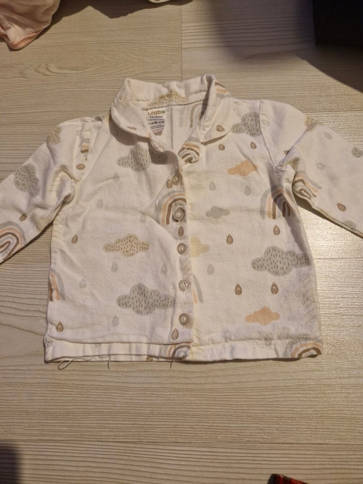 Pamuklu kumaştan yapılmış, uzun kollu, düğmeli ve yakalı unisex pijama takımı.Beyaz zemin üzerinde pastel bulut ve damla desenleri bulunur. Rahat kesimlidir. ☁️ 9 aylık 74 cm. hic kullanilmadi desem yalan olmaz.