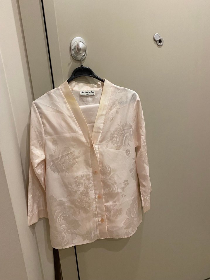 Bej renkli, V yakalı, uzun kollu ve düğmeli mini gömlek. İnce çiçek desenli, vintage Paris tarzında, hafif ve parlak kumaş.