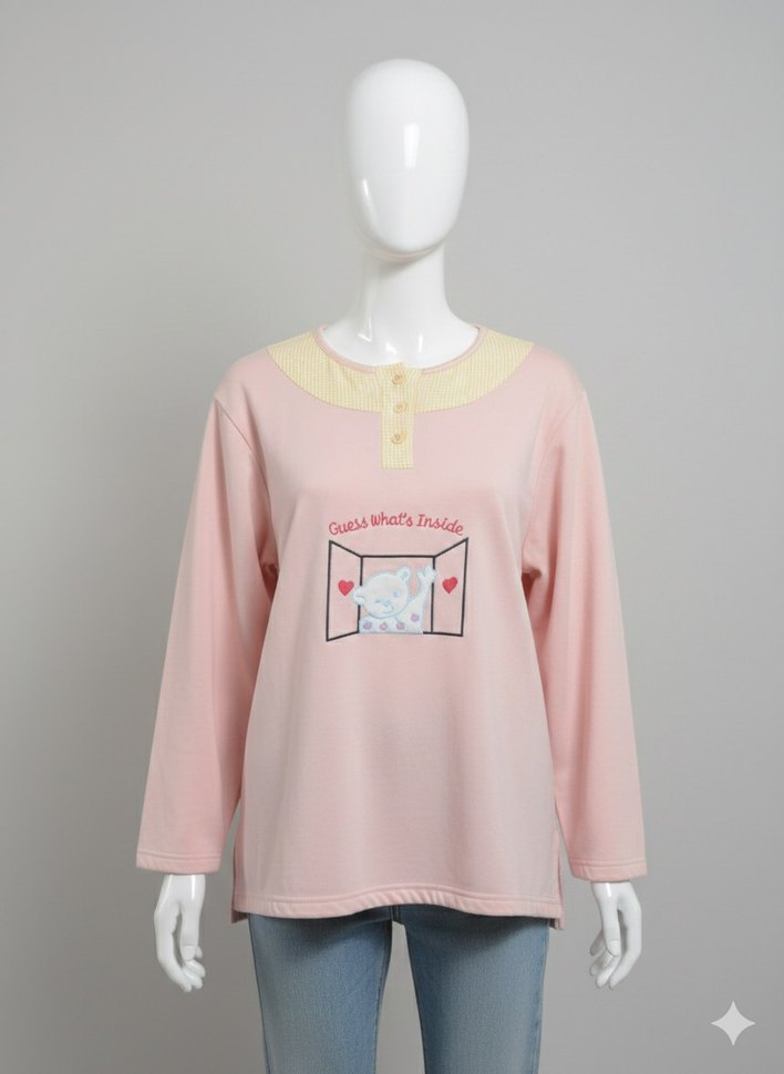Pastel pembe, uzun kollu, düğmeli yakalı, baskılı ve bol kesim pijama üstü / sweatshirt. Yumuşak ve sıcak dokulu kumaştan, günlük rahat kullanıma uygun. Vintage Estetik Ayıcık Nakışlı Pastel Pembe Pijama Üstü / Sweatshirt Hem evde şık ve rahat olmak isteyenler hem de "cottagecore" veya "soft" tarzı sevenler için harika bir parça! Ürün, soft pembe tonu ve yakasındaki sarı pötikare (gingham) deseniyle çok özgün bir görünüme sahip. çok minik lekeleri var kullanıma engel değildir fotoğrafladım