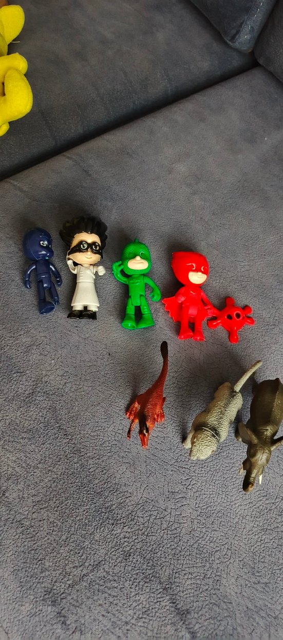 Çok renkli çizgi film karakter figürleri ve farklı pozlarda dinozor oyuncakları içeren set. Canlı koyu tonlara sahip figürler.#pijamaskeliler#meyvesetioyuncağı#hayvanfigürler#