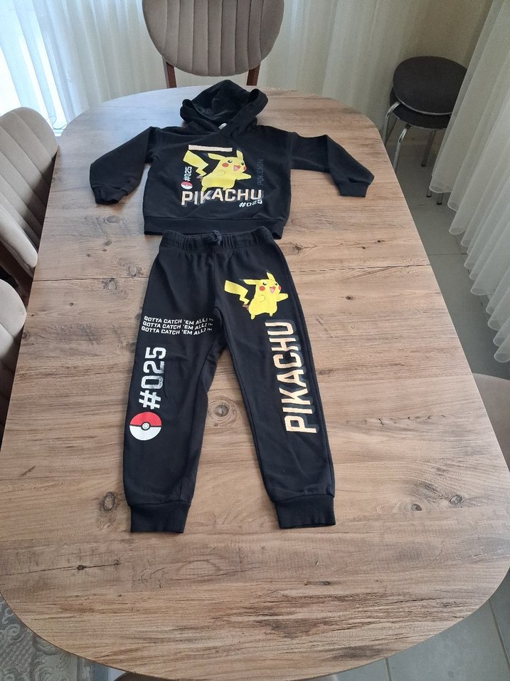 h&m ı.7 yaş yırtık sökük yoktur sadece dizindeki yazılatda hafif silinme mevcut içi polarlı üst boy 45 cm iki koltuk arası 38 cm alt boy 69 cm bel 27 cm lastikli. Siyah kapüşonlu sweatshirt ve baskılı Pikachu desenli, pamuklu ve yumuşak kumaştan erkek eşofman takımı. Rahat kesimli, lastikli paçalı ve örgü detaylıdır. ⚡️