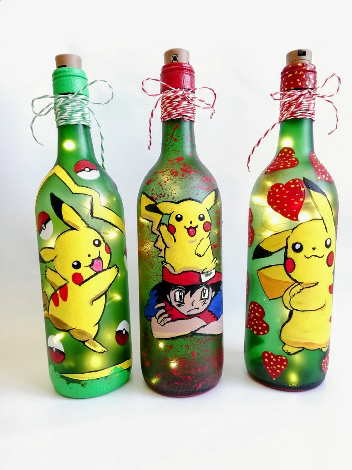 Tek ürün fiyatıdır. Pikachu ve Pokémon temalı, içi ışıklı renkli dekoratif şişeler. Akrilik boya ile işlediğim figürler içerisinde mantar şeklinde peri led ışık değiştirilebilir üç adet pil vardır.
