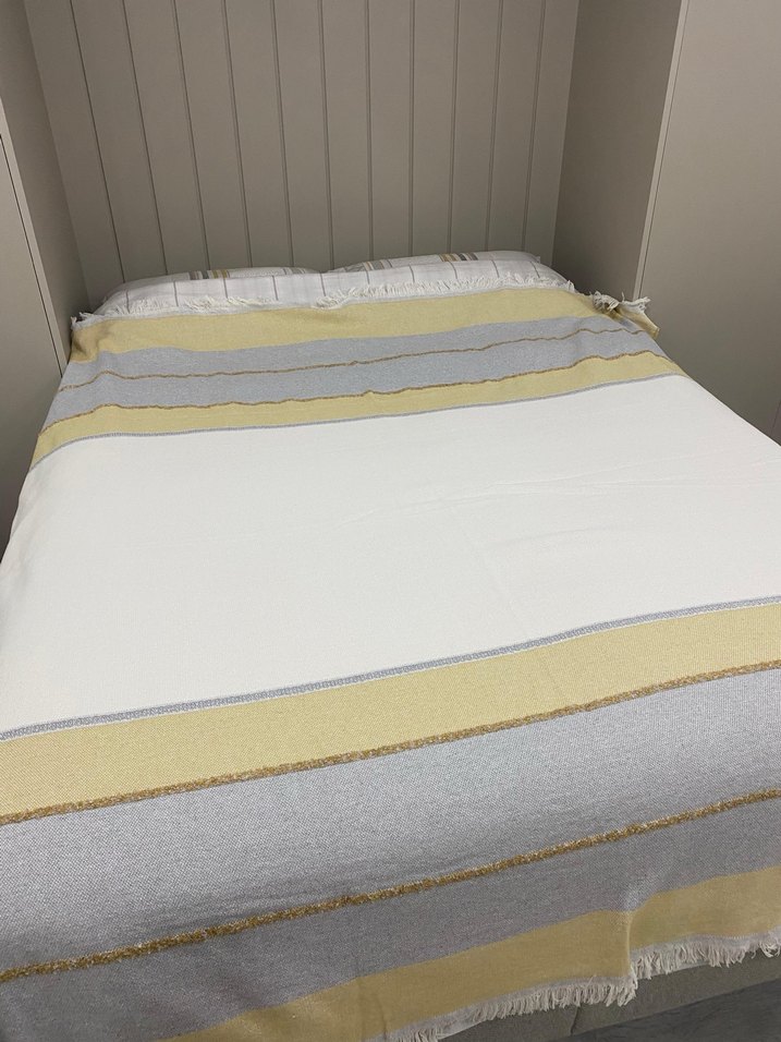 Yumuşak kumaştan, beyaz ve gri çizgili, sarı detaylı yatak örtüsü. Çizgili desenli ve püsküllü kenarlara sahiptir. HİÇ KULLANILMADI KARACA MARKA