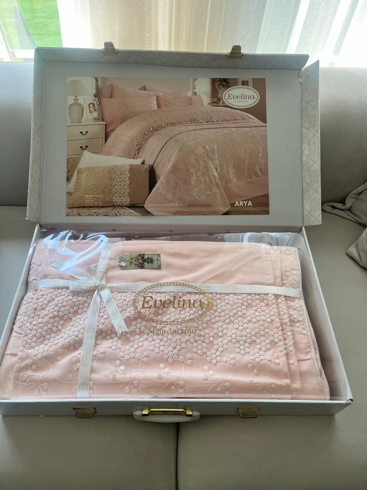 Ürün hiç kullanılmadı, evelina Home Collection dan alındı, arya pike takımı olarak geçiyor. Set içeriği: Pike örtüsü, lastiksiz çarşaf, 2 süs yastığı, 2 normal yastık kılıfı mevcut. Kutulu duruyor o şekilde gönderim yapılacak.