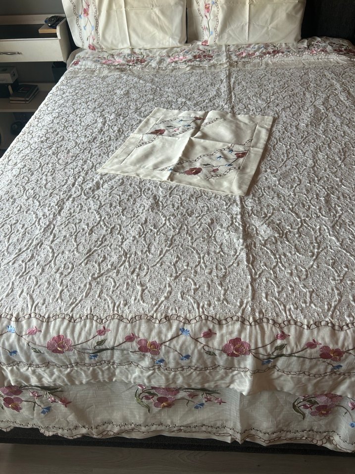 Resim çekmek için serildi pike boy 2.20 cm eni 2.10 cm çarşaf boy 2.00 cm eni 1.60 cm etek ucu 47 cm iki yastık boy 68 cm eni 49 cm bir kırlent kare 50 cm