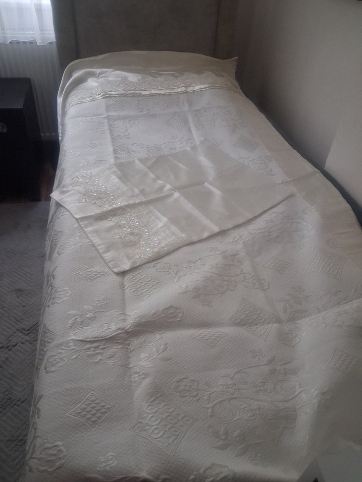 Parlak işlemeli desenlere sahip beyaz yatak örtüsü ve uyumlu yastık kılıfı ile zarif bir görünüm sunar. ️ Tek kişilik Sünnet te 1 kere kullanıldı sadwce serildi.