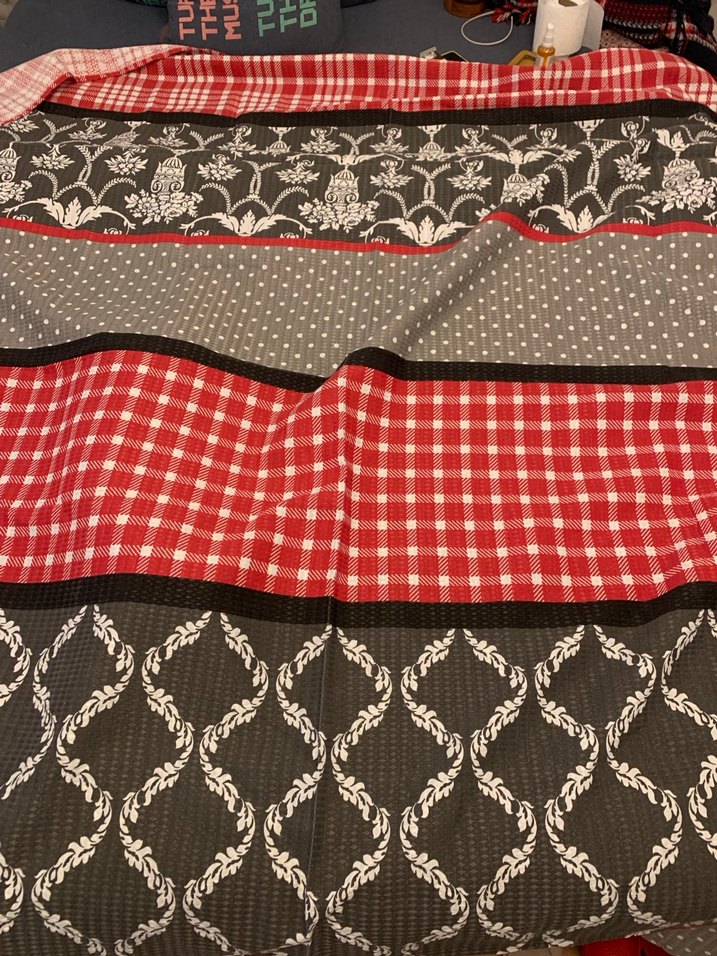 Kırmızı ve gri renklerde, çiçek ve kare desenlerin birleştiği desenli, pike, yatak örtüsü, koltuk örtüsü, hiç kullanılmadı, sadece bir kere yıkandı, aynı üründen bir tane daha var ölçüler..1.96 x 2.11
