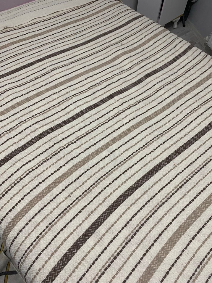 Bej ve gri çizgili, dokulu desene sahip yumuşak ve sıcak tutan battaniye. ️ Çift Kişilik Pamuklu Pike/Yatak Örtüsü
