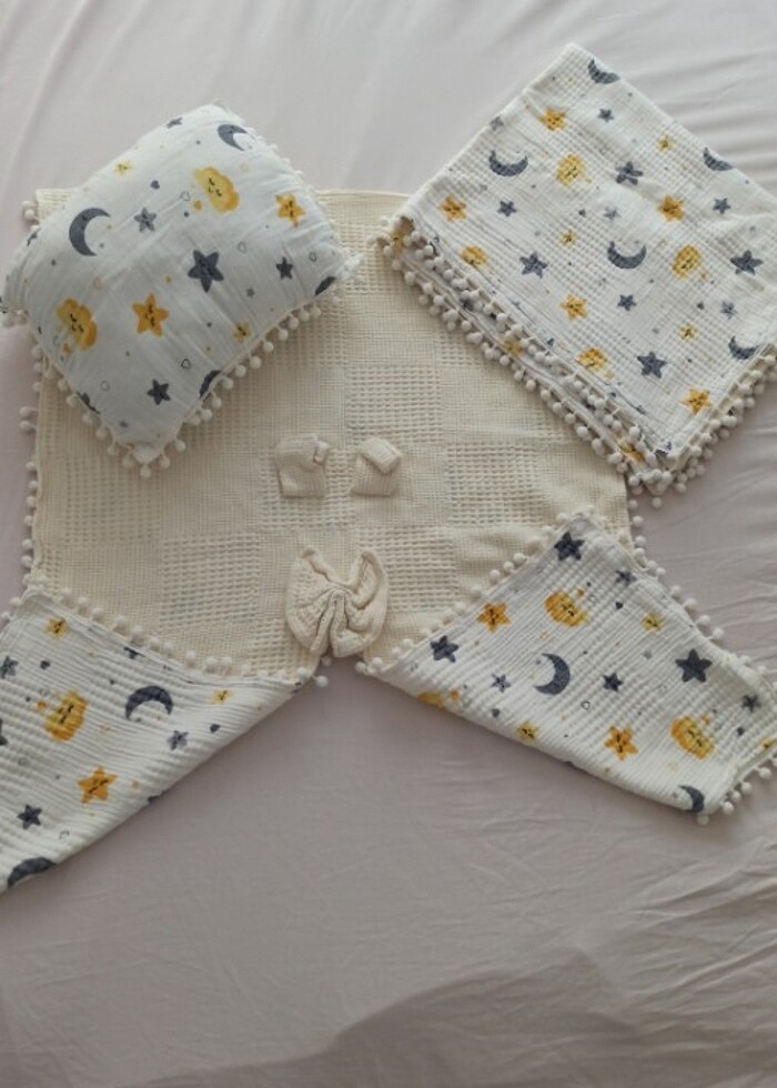 Puset örtüsü yastık ve ayriyeten pikesi vardır bir tarafı muslin kumastan diğer taraf pamuk ı pikedir kesinlikle terletme yapmaz hiç bir kusuru yoktur. Çok az kullanilmistir