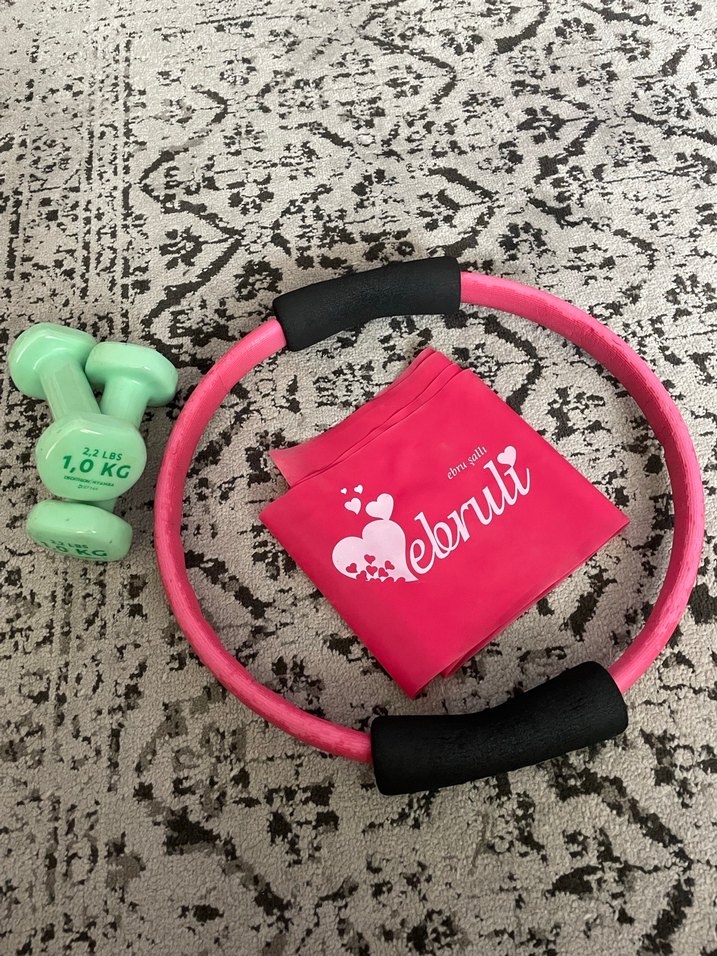 Bir kg decathlon domyos dambıl, ebru şallı plates egzersiz bandı ve cosfer pilates çemberi.