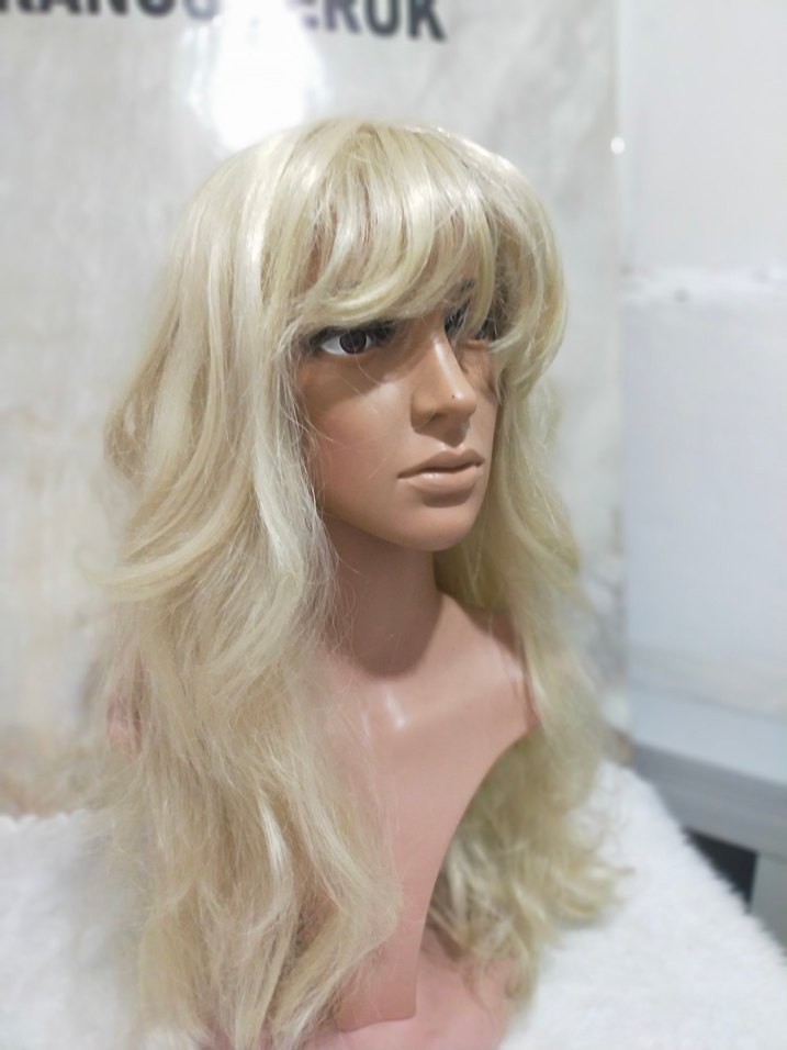 Uzun dalgalı ve kahküllü, pilatin renk sentetik peruk, bohem ve retro tarzı yansıtır. Zahmetsiz şıklık için ideal.