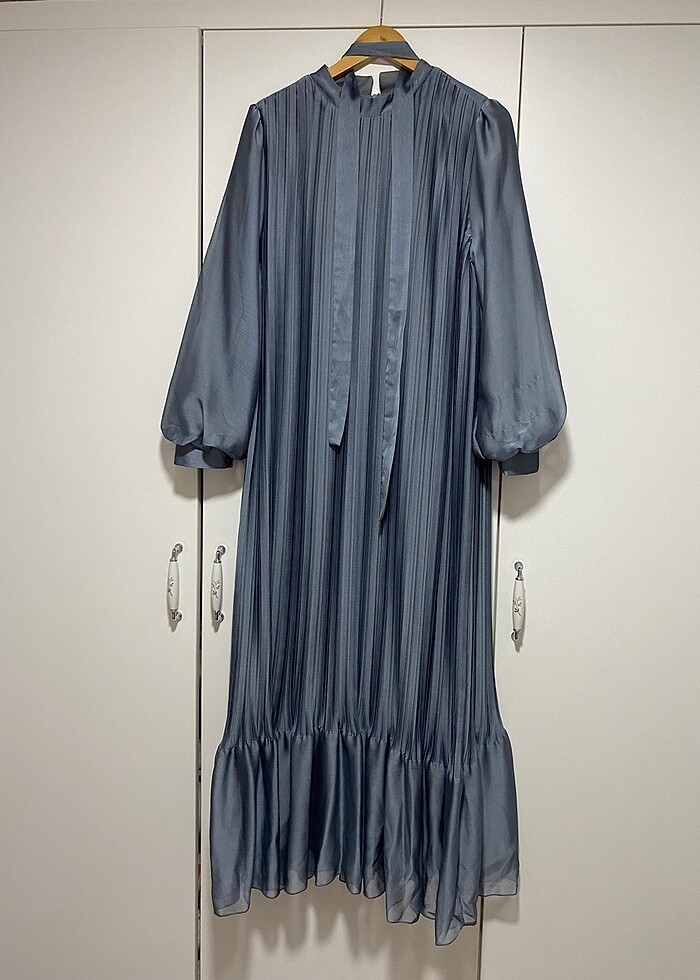 Pileli abiye kumaş gri elbise 50 bedendir fakat dar kalıptır 46-48 bedene uyumludur sadece bir kez giyilmiştir. Yanında eşarpla mevcuttur.