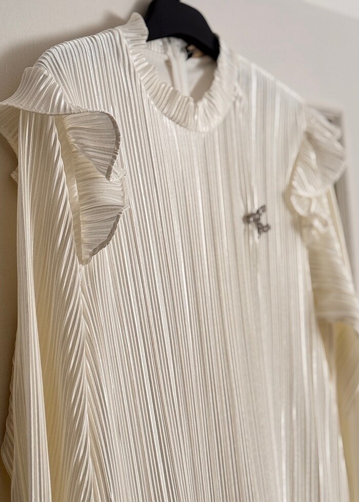 Elbise sadece bir kez nikahımda giyildi. Omuzları fırfır detay boydan pileli kırık beyaz renginde kendinden astarlı iç belli etmez. Broşu mevcuttur aynı renk ve kumaştan kemeri de mevcuttur. Şifon kumaştan aynı renkten şal da hediyedir. Herhangi bir tadilat yapılmamıştır. 42 beden