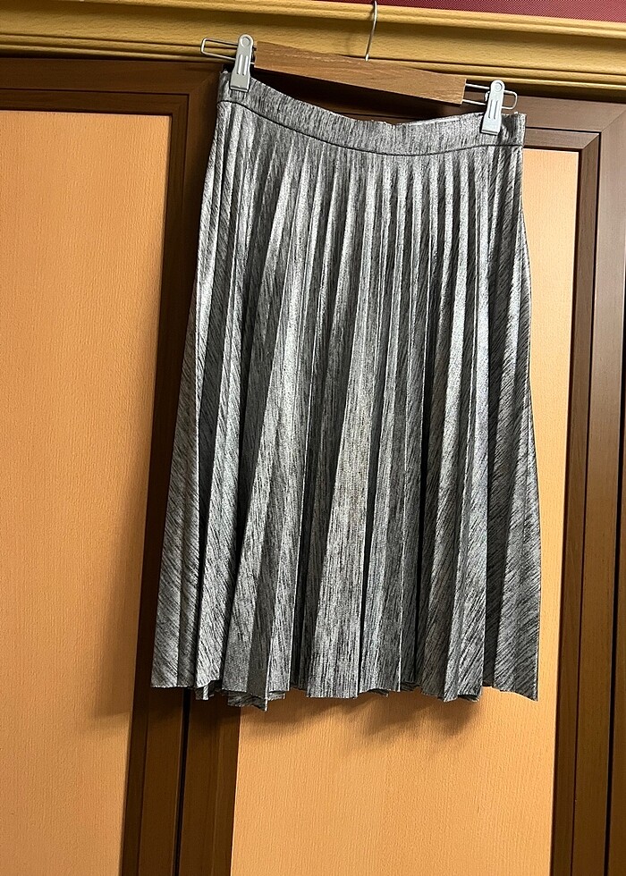 Gri simli görünümlü pileli etek diz boyunda