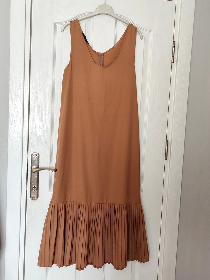 Kolsuz ve yuvarlak yakalı uzun elbise, etek ucu pike detaylı. Rahat bir bol kesime sahiptir. Günlük kullanım için uygundur. Bir kez aile tanışmasında giyildi.