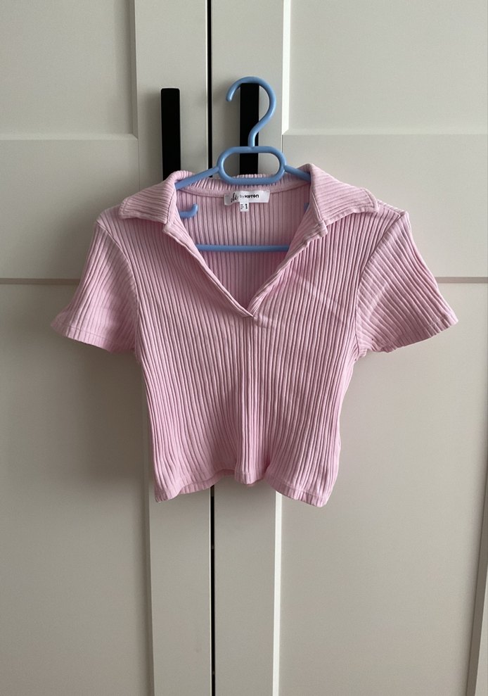 Pileli dokulu, yakalı ve kısa kollu pudra pembe polo tişört. Yumuşak sentetik kumaştan, trend sokak stili için uygun.