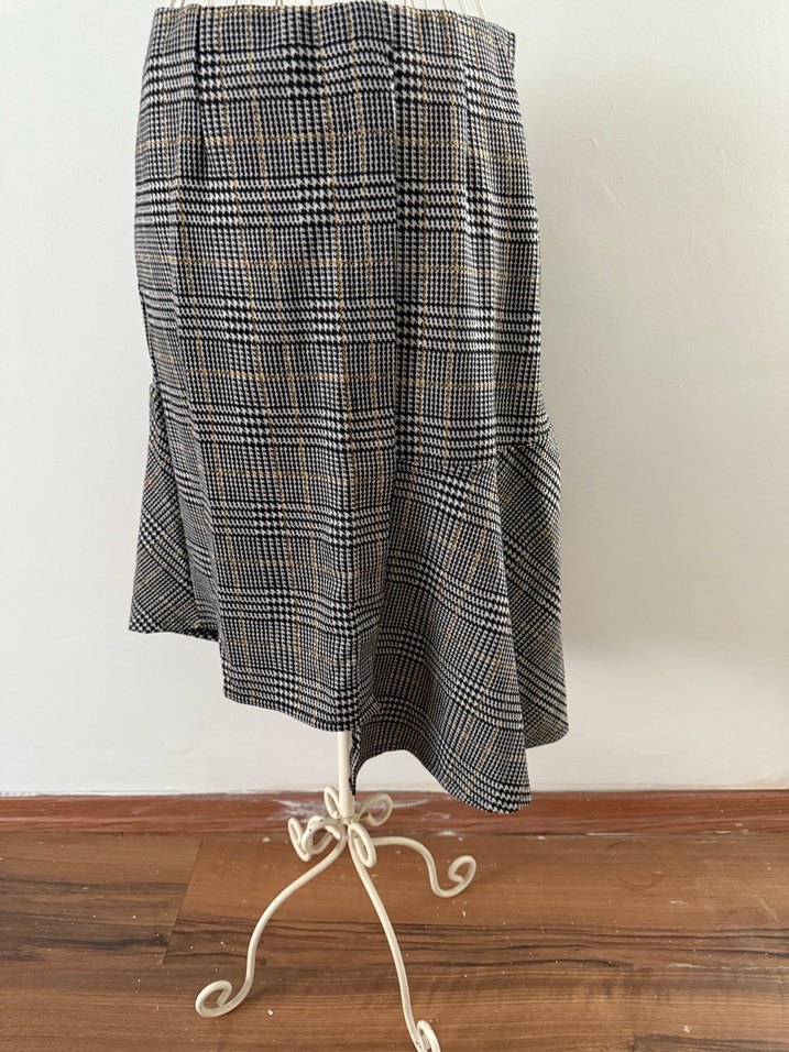 Simetrik etkilerli bej ve gri tonlarında ekose desenli. Sentetik kumaştan, düzenli kesim, ofis için uygun, çağdaş Paris tarzı.
