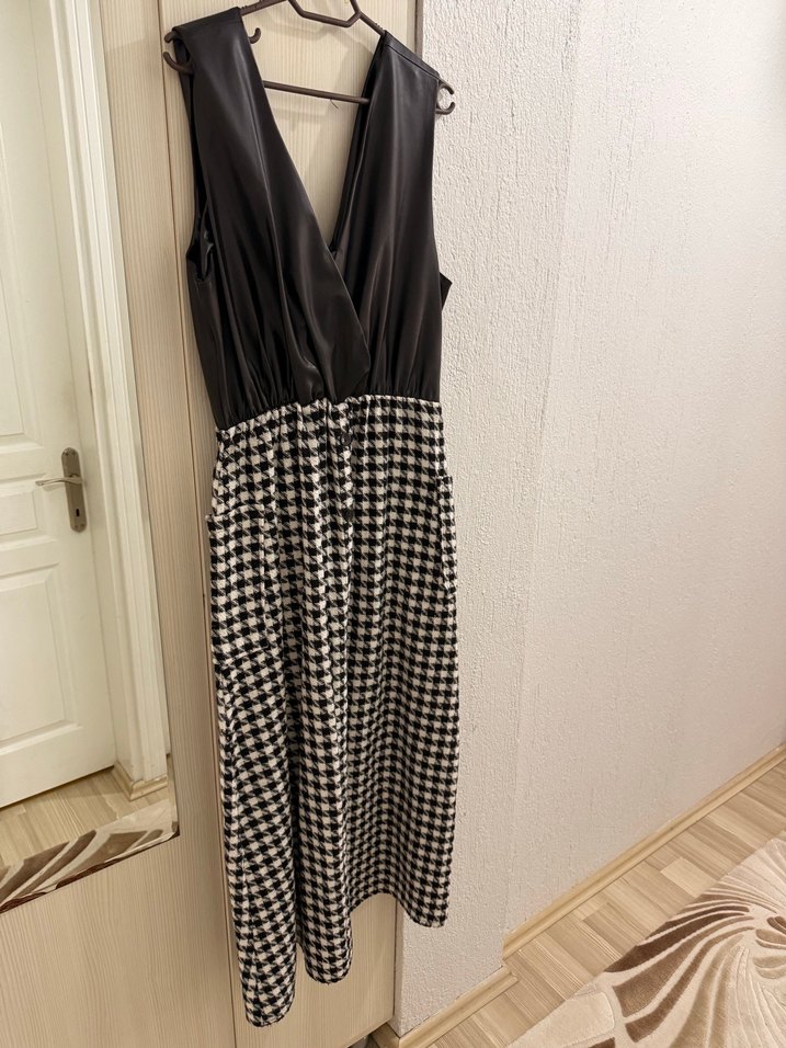 V yaka, kolsuz, pileli ve ekose desenli uzun elbise. Üst kısmı siyah deri , alt kısmı siyah beyaz ekose desendir. Sokak stili için uygun. Dikkat ⚠️ benim boyum 160 kilo 62