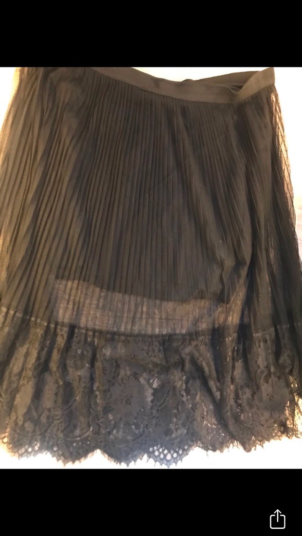 Bu siyah midi etek, pileli ve bol kesimdir, sentetik kumaştan yapılmıştır. Dantel etek ucu, gotik ve avangart tarzlar için uygundur.