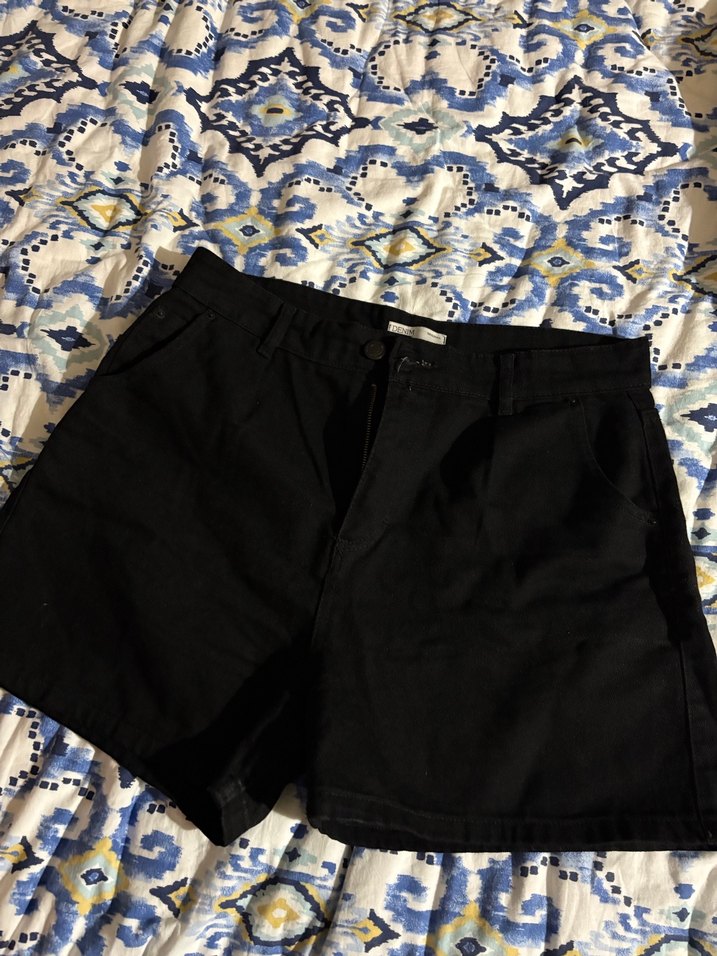 Siyah denim şort, bol kesim ve pile detaylara sahiptir. İdeal boylu ve sade tasarımıyla günlük kullanıma uygundur.