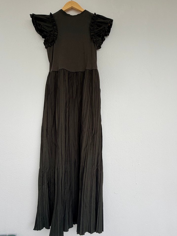 Keten kumaştan yapılmış, pileli detaylara ve bol kesime sahip haki yeşili-antrasit arası bir renge sahip uzun elbise. Askılı kolları ve yuvarlak yakasıyla günlük kullanım için uygundur. Yandan cepleri mevcut. Hiç giyilmedi. M-L bedene uyumludur.