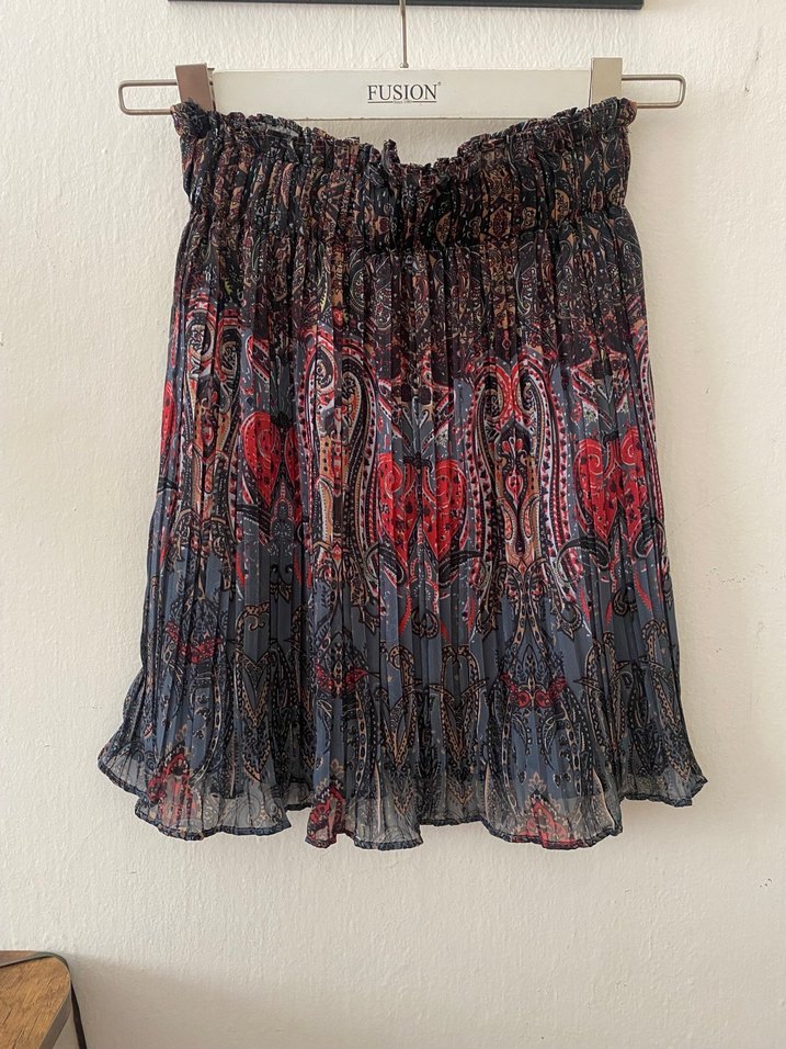Pilili, bol kesim, koyu çok renkli batik desenli kısa mini etek. Romantik buluşmalar için uygun. Üzerinde trendyol etiketi bulunur. 34 beden yazıyor fakat 36/38/40 bedene olur. Çak rahat