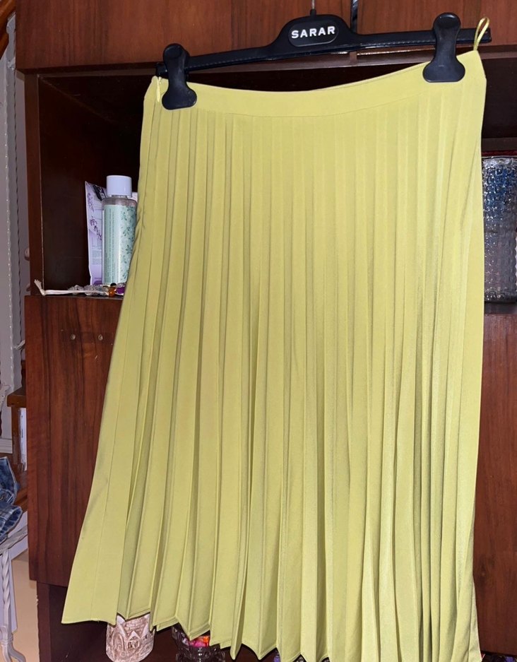 Etek, pilili ve bol kesimdir.
