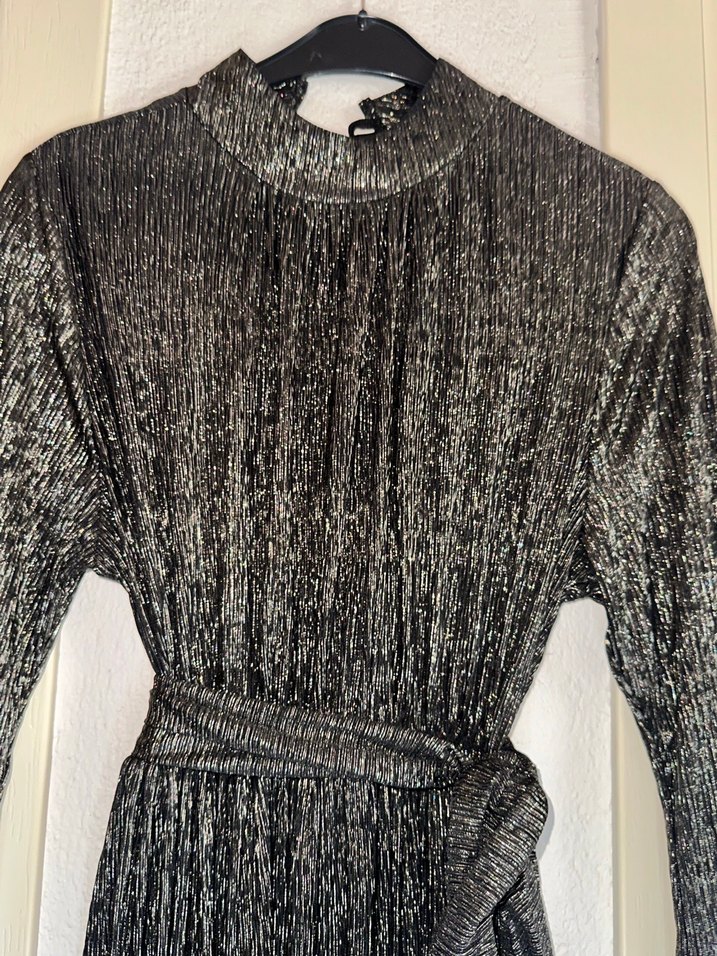 Yüksek yakalı, askılı kolları ve pilili parlak gri kumaşı ile desenli, vücuda oturan uzun abiye elbise, avant-garde parti stiline uygundur.✨