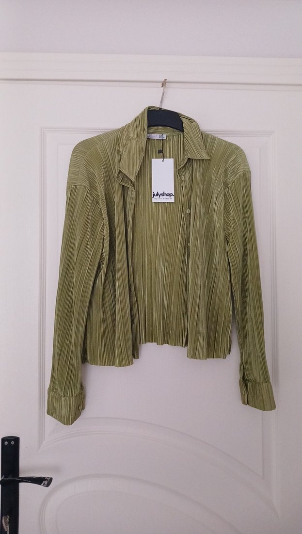 Khaki renkte, pilili ve kısa kesim keten gömlek. Uzun kollu ve kesik yaka detayına sahip, rahat ve parlak dokulu. gömlek pantolon takım SADECE PANTOLON KALDI SATIŞTA