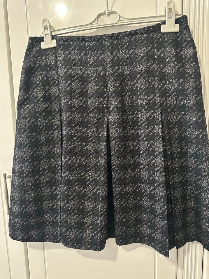 yün kumaştan, pilili ve bol kesime sahip midi uzunluğunda bir kadın eteği. Ofis ortamına uygun sade deseni ile normcore tarzda.