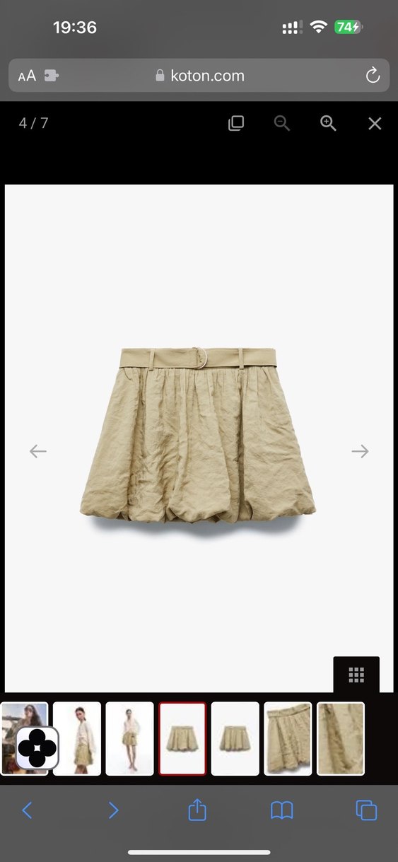 Bej renkli keten mini etek, pilili detaylara ve bol kesime sahiptir. Hafif ve nefes alabilir kumaşıyla günlük kullanıma uygundur.