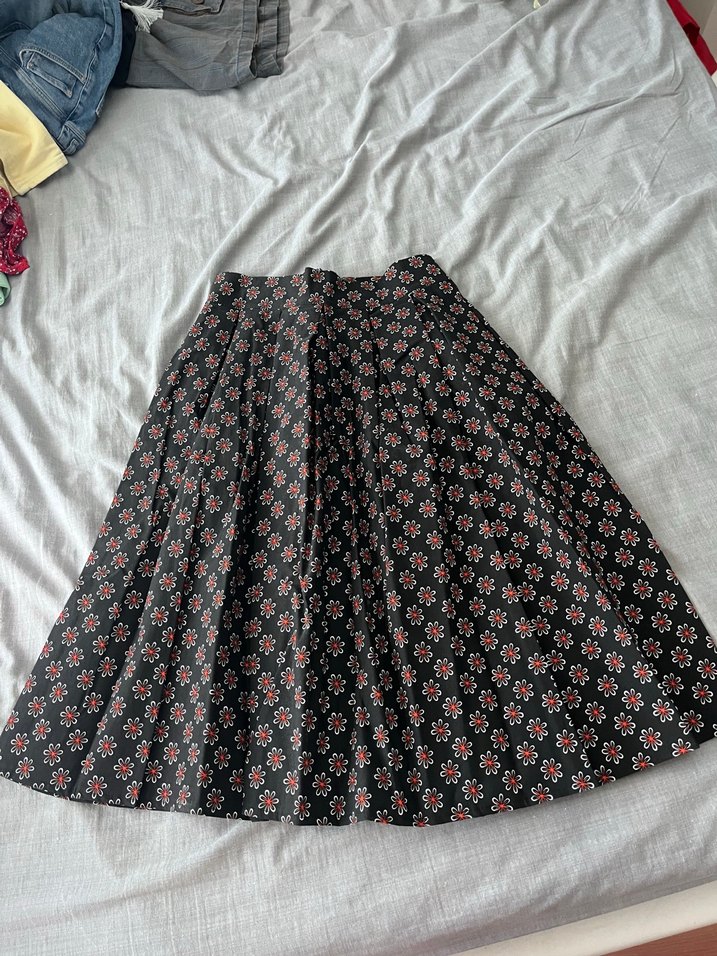 Bu siyah midi çiçekli etek, konforlu pilili ve bol kesimdir. Yumuşak sentetik kumaştan yapılmış, günlük kullanıma uygun vintage tarz sunar.