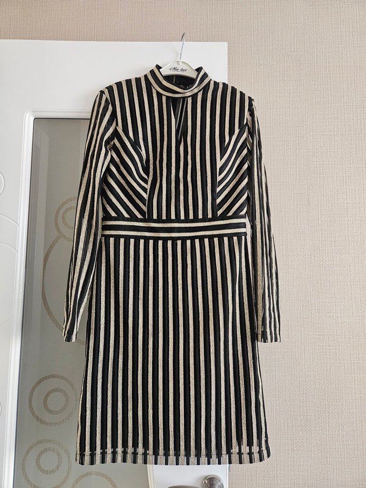 Dar kesim midi triko elbise, uzun kollu ve yüksek yakalıdır. Siyah-bej çizgili deseni ve pilili detaylarıyla modern Paris sokak modasını yansıtır.