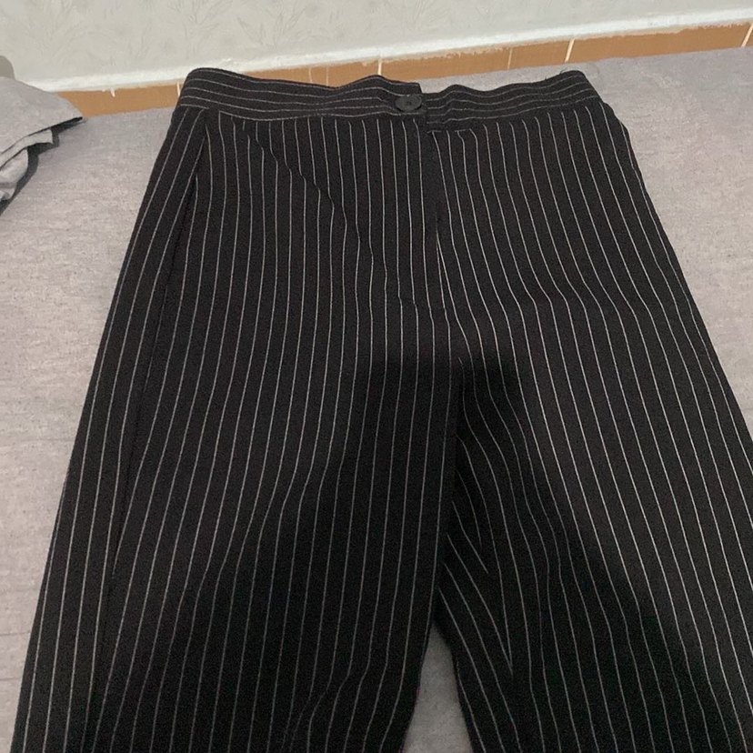 Pilili, çizgili siyah kadın kumaş pantolon, normal boy ve regular fit. Ofis ve günlük şık kombinlere uygun.