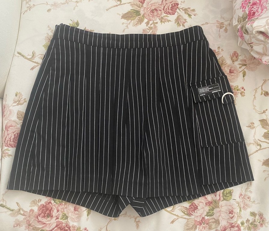 Siyah beyaz çizgili, pilili ve regular fit şort. Kısa boy, ofis ve günlük kullanıma uygun. Sentetik kumaştan üretilmiştir.