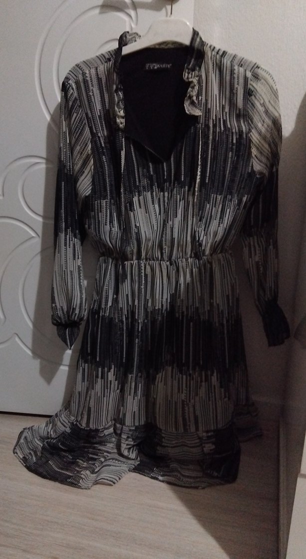 Uzun siyah hamile tunik, pilili ve desenli yapısıyla, bol kesim ve V yakasıyla dikkat çekiyor. Askılı kollu ve ofis için uygun tarzda.