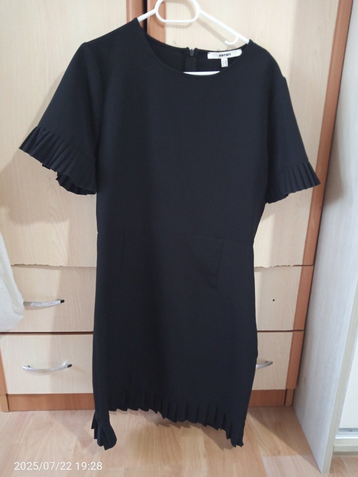 Kısa pilili kollara ve bisiklet yakaya sahip, vücuda oturan siyah midi elbise. Minimal ve trend günlük stil için uygun.