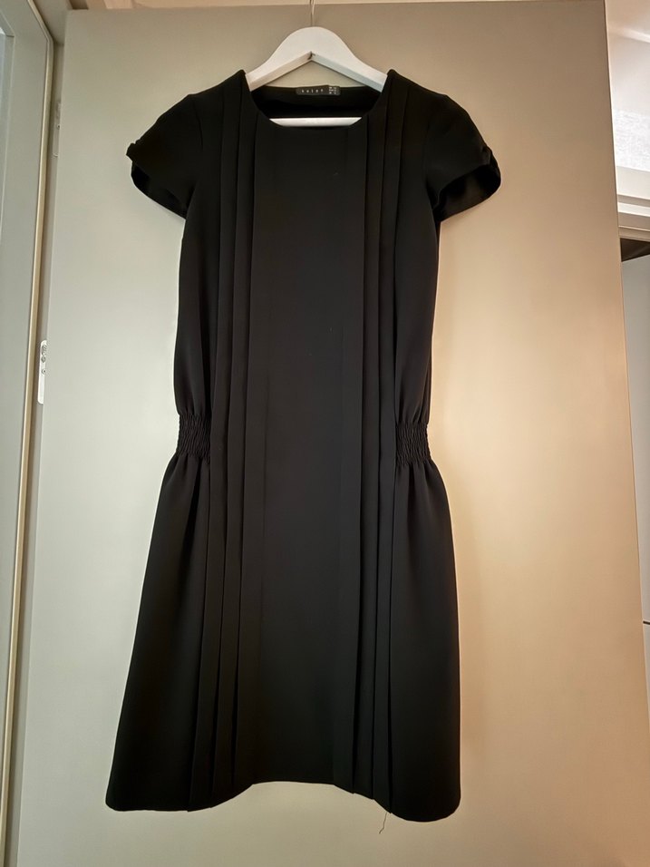Kısa kollu, pilili detaylı siyah elbise. Yuvarlak yaka ve regular fit ile modern klasik tarzda, ofis için uygun.