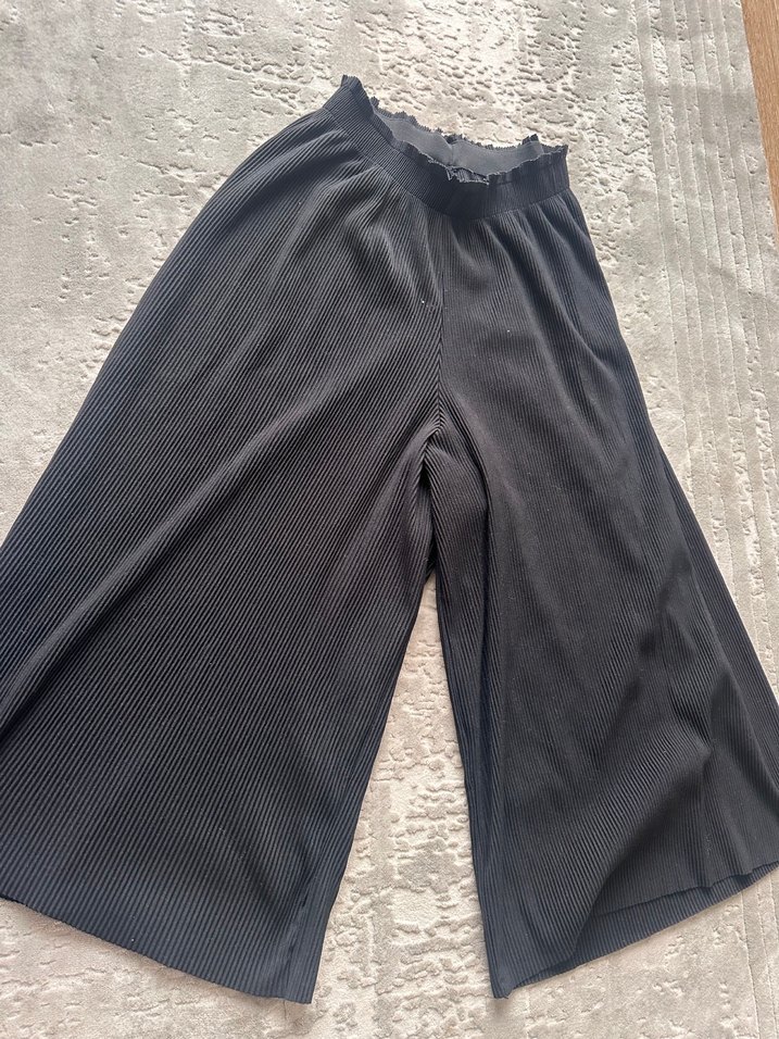 Pilili, midi boy, bol kesim siyah keten pantolon, rahat günlük kullanım için uygundur.