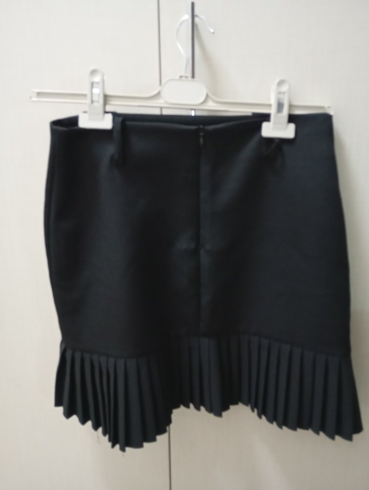 Diz üstü pilili siyah mini etek, sentetik kumaştan, ofis kullanımı için uygun gotik Parisian tarzında şık bir parça.